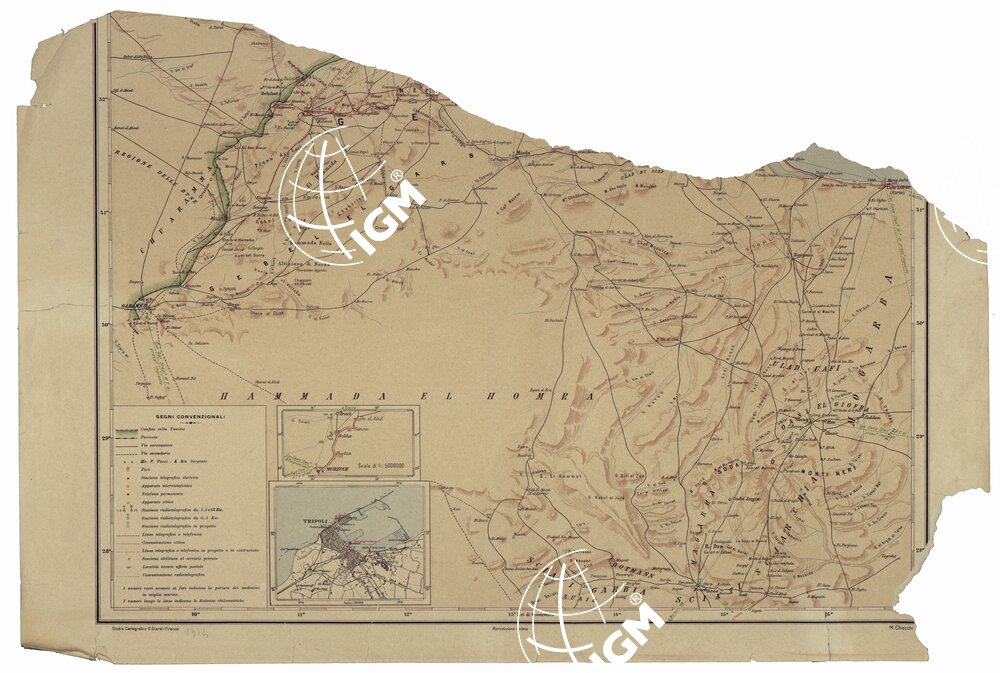 La stessa carta di cui al N° 26 d’ordine (N. 2132 d’ inventario), mostrante, mediante numerosi segni convenzionali, la distribuzione del servizio telegrafico e radiotelegrafico. Tre cartine speciali per Tripoli e le linee Murzuch-Um el Abid e Casr Zafran (Sirte)-Nufilia sono alle scale rispettive di