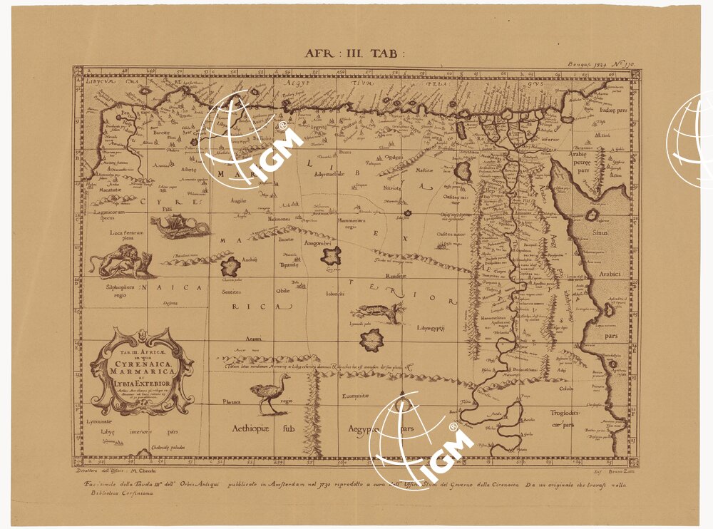 Documento composto da 3 fogli più la copertina. Fac-simile della Tavola III dell’Orbis Antiqui pubblicato in Amsterdam nel 1730 riprodotto a cura dell’Ufficio Studi del Governo della Cirenaica da un originale che trovasi nella Biblioteca Corfiniana. Rappresentazione orografica a monticelli. Governo della Cirenaica, Ufficio Studi. Tipo-Litografia del Governo della Cirenaica, Bengasi.