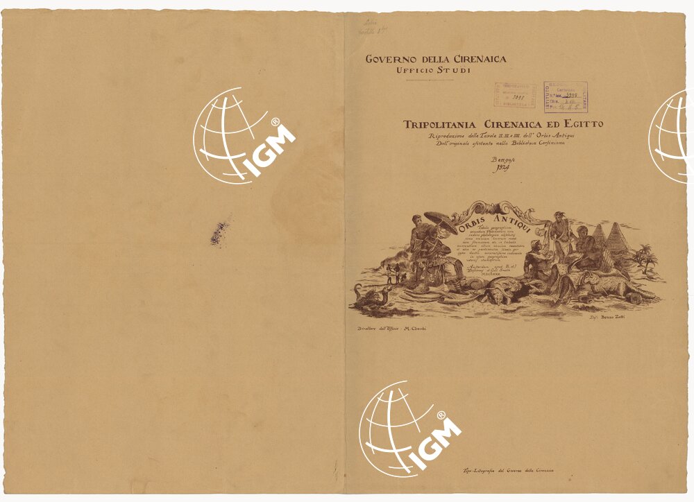 Documento composto da 3 fogli più la copertina. Fac-simile della Tavola II dell’Orbis Antiqui pubblicato in Amsterdam nel 1730 riprodotto a cura dell’Ufficio Studi del Governo della Cirenaica da un originale che trovasi nella Biblioteca Corfiniana. Rappresentazione orografica a monticelli. Governo della Cirenaica, Ufficio Studi. Tipo-Litografia del Governo della Cirenaica, Bengasi.