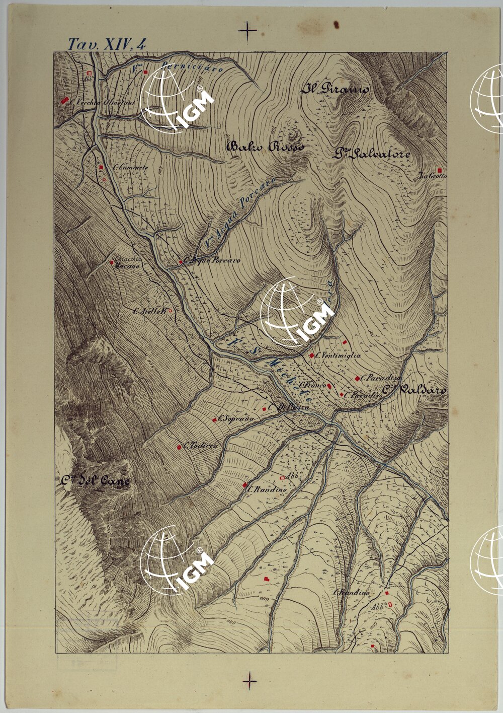 CARTA DEI DINTORNI DI PALERMO ALLA SCALA DI 1 A 10.000 PER LEMANOVRE SULLA CARTA ESEGUITA MEDIANTE INGRANDIMENTO GEOMETRICO DELLA CARTA AL 50.000, RIVEDUTA E COMPLETATA IN OGNI PARTE SUL TERRENO, CON STRUMENTI PER LEVATE SPEDITIVE – TAVOLA XIV 4.
