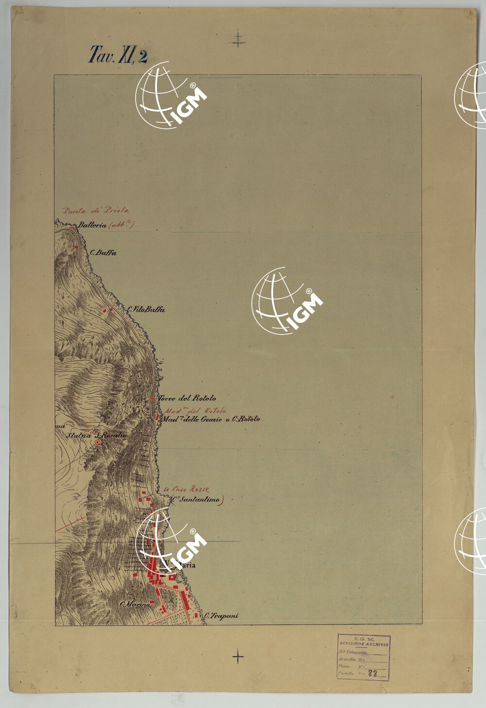 Questa carta si compone di 60 fogli oltre il foglio Titolo ed il Quadro d’Unione. E’ riprodotta in litografia a colori. Essa venne eseguita in sostituzione di una preesistente carta, ormai troppo antiquata, posseduta dal Presidio di Palermo. Poggiato sull’ingrandimento geometrico della carta al 50.000 e i punti trigonometrici fissati dall’I.G.M. questo lavoro venne completato con accurate ricognizioni sul terreno affidate ad Ufficiali dei vari Corpi del Presidio. I particolari vennero inseriti o in base a rilevamenti parziali eseguiti con strumenti per le levate speditive, o in base alle nuove mappe catastali messe a disposizione dalla Direzione del Catasto di Palermo.I segni convenzionali usati furono quelli adottati dall’Ist. Geog. Militare con modificazioni ed aggiunte in vista dello scopo speciale della carta. Oltre alle curve orizzontali tracciate di 50 in 50 metri vennero inseriti, in seguito alle ricognizioni sul terreno, curve dimostrative a tratteggio a fine di rendere maggiormente evidenti le forme del terreno. La riproduzione litografica a colori venne affidata alla Sezione R.R. Carabinieri. Tratteggio e curve di livello sono in bistro, abitati e costruzioni in rosso, acque in azzurro, strade principali in tinta derivata dal rosso, scritture in nero. Il territorio rappresentato si estende dall’Isola delle Femmine a Bagheria, alla Piana dei Greci (attuale Piana degli Albanesi). Annessa una notizia sulla costruzione della carta, pubblicata dal Comando della Divisione Militare Territoriale di Palermo (23a).
