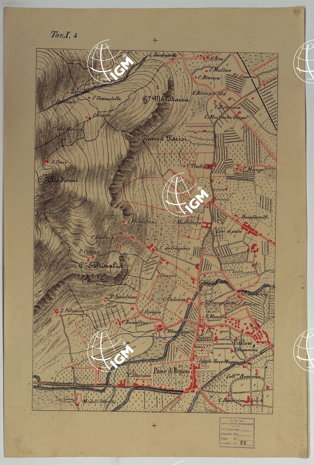 CARTA DEI DINTORNI DI PALERMO ALLA SCALA DI 1 A 10.000 PER LEMANOVRE SULLA CARTA ESEGUITA MEDIANTE INGRANDIMENTO GEOMETRICO DELLA CARTA AL 50.000, RIVEDUTA E COMPLETATA IN OGNI PARTE SUL TERRENO, CON STRUMENTI PER LEVATE SPEDITIVE – TAVOLA X 4.