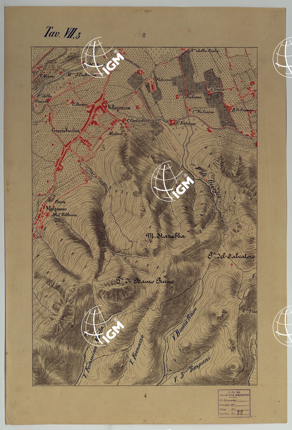 CARTA DEI DINTORNI DI PALERMO ALLA SCALA DI 1 A 10.000 PER LEMANOVRE SULLA CARTA ESEGUITA MEDIANTE INGRANDIMENTO GEOMETRICO DELLA CARTA AL 50.000, RIVEDUTA E COMPLETATA IN OGNI PARTE SUL TERRENO, CON STRUMENTI PER LEVATE SPEDITIVE – TAVOLA VII 3.
