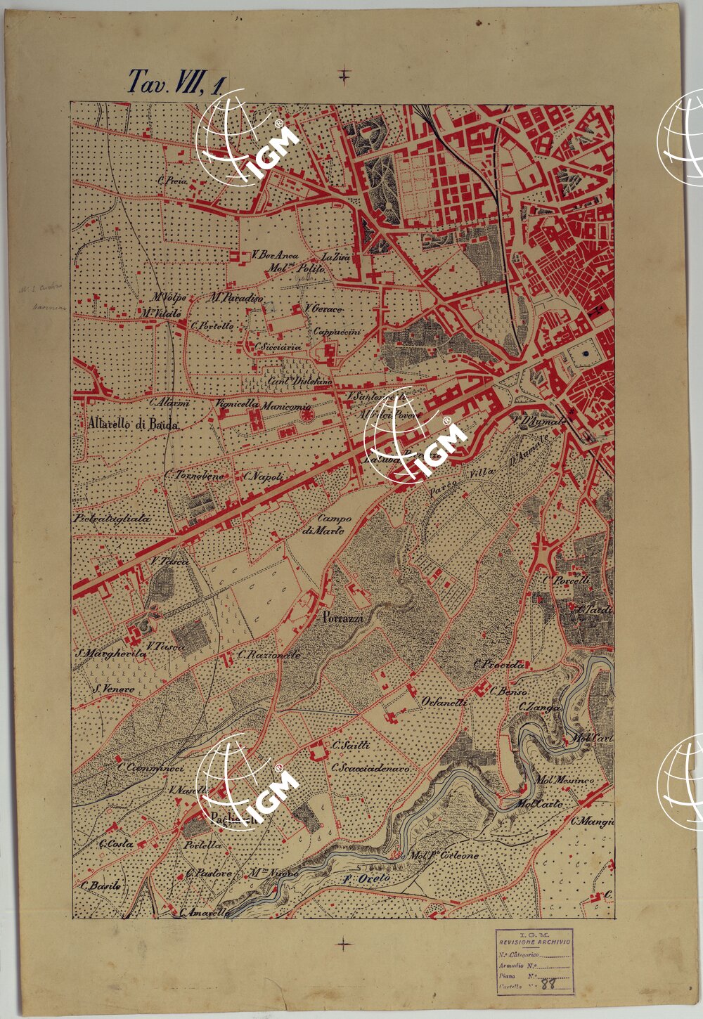 CARTA DEI DINTORNI DI PALERMO ALLA SCALA DI 1 A 10.000 PER LEMANOVRE SULLA CARTA ESEGUITA MEDIANTE INGRANDIMENTO GEOMETRICO DELLA CARTA AL 50.000, RIVEDUTA E COMPLETATA IN OGNI PARTE SUL TERRENO, CON STRUMENTI PER LEVATE SPEDITIVE – TAVOLA VII 1.