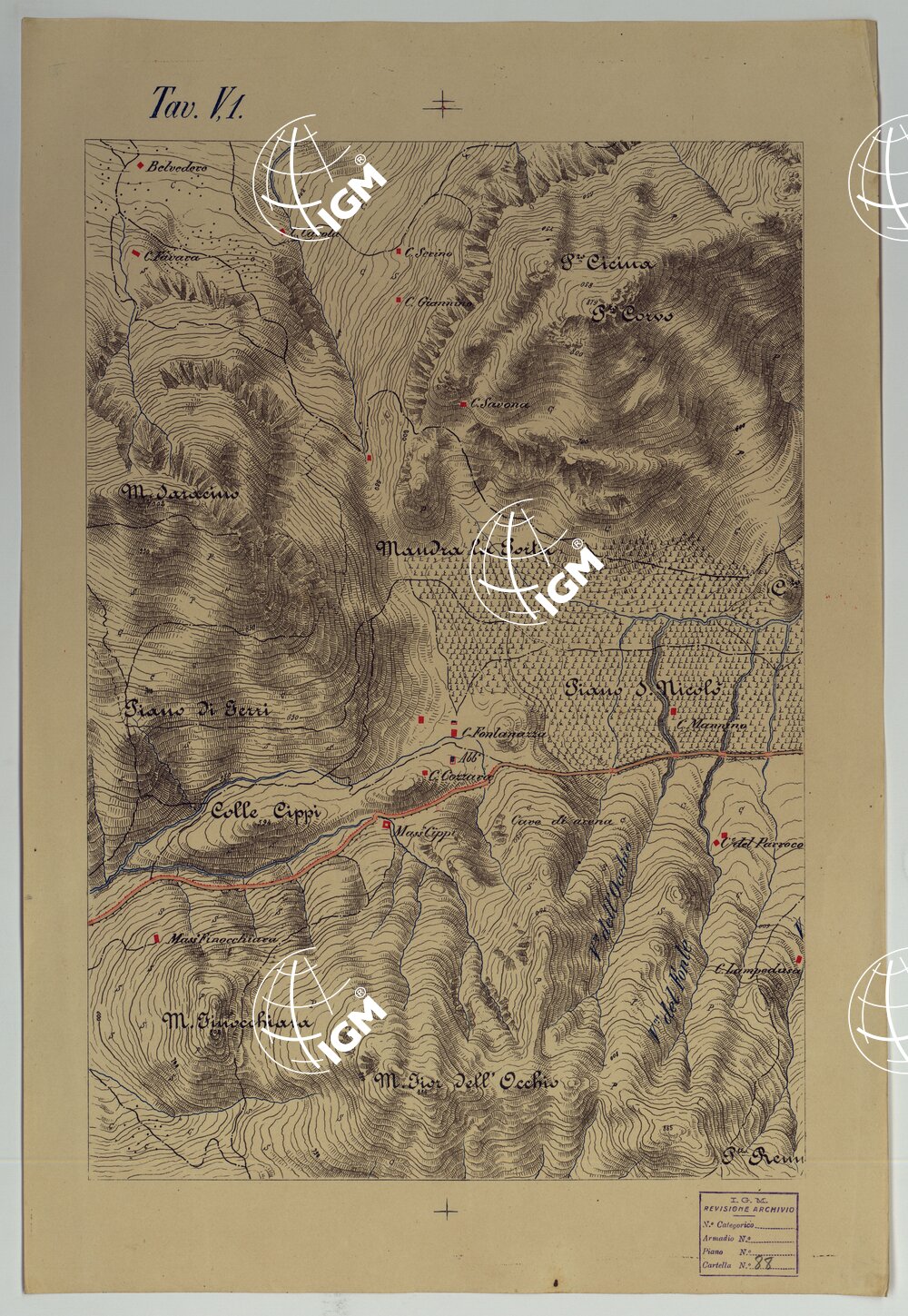 CARTA DEI DINTORNI DI PALERMO ALLA SCALA DI 1 A 10.000 PER LEMANOVRE SULLA CARTA ESEGUITA MEDIANTE INGRANDIMENTO GEOMETRICO DELLA CARTA AL 50.000, RIVEDUTA E COMPLETATA IN OGNI PARTE SUL TERRENO, CON STRUMENTI PER LEVATE SPEDITIVE – TAVOLA V 1.
