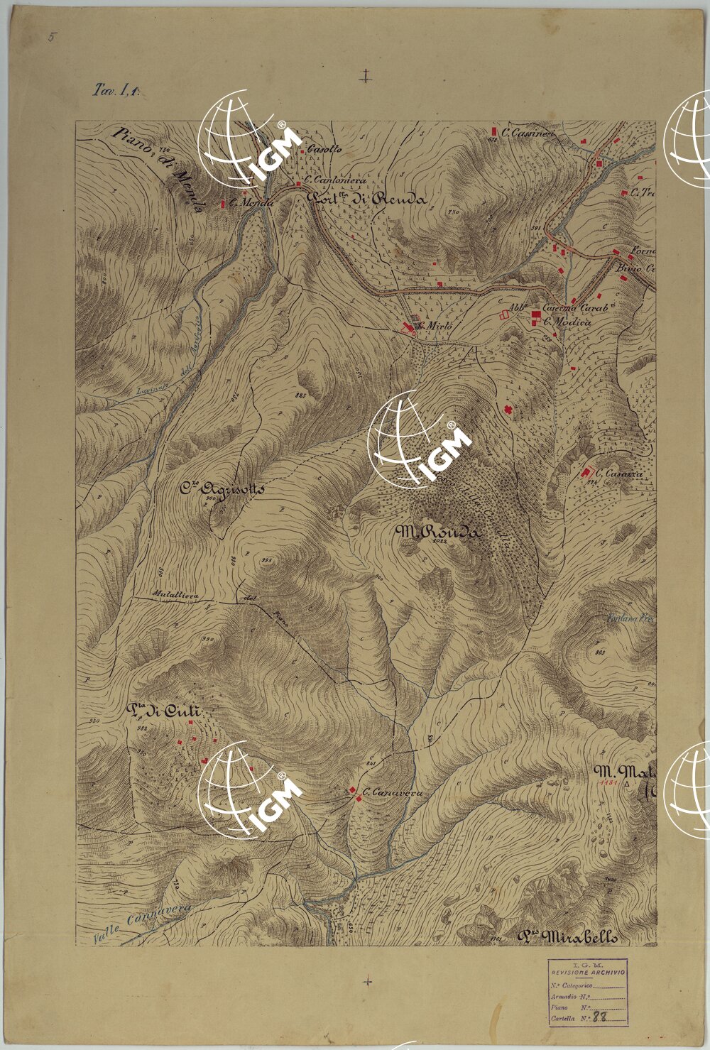 CARTA DEI DINTORNI DI PALERMO ALLA SCALA DI 1 A 10.000 PER LEMANOVRE SULLA CARTA ESEGUITA MEDIANTE INGRANDIMENTO GEOMETRICO DELLA CARTA AL 50.000, RIVEDUTA E COMPLETATA IN OGNI PARTE SUL TERRENO, CON STRUMENTI PER LEVATE SPEDITIVE – TAVOLA I 1.