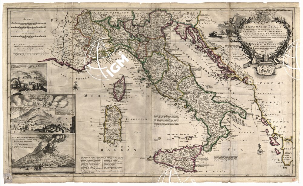 Incisione su rame con l’orografia a monticelli e confini politici a colori. Una nota avverte che la rete stradale è basata sui dati di Jacopo Cantelli. A sinistra della carta si trovano tre incisioni tra cui il M. Vesuvio durante la eruzione del 1631 e il M. Etna durante la eruzione del 1669. La carta distingue con segni convenzionali, di cui è data apposita leggenda, gli arcivescovadi, i vescovadi e le abbazie. E’ corredata di numerose leggende, in lingua inglese, fornenti notizie di carattere vario sui principali oggetti geografici. In basso a sinistra è dato l’elenco dei vari stati italiani e delle rispettive sovranità. Le longitudini provengono dall’isola del Ferro. La carta è dedicata al Principe Eugenio di Savoia e fa parte della stessa serie della carta di cui al n. 30 d’ordine (Coll. Muller, n. 18).