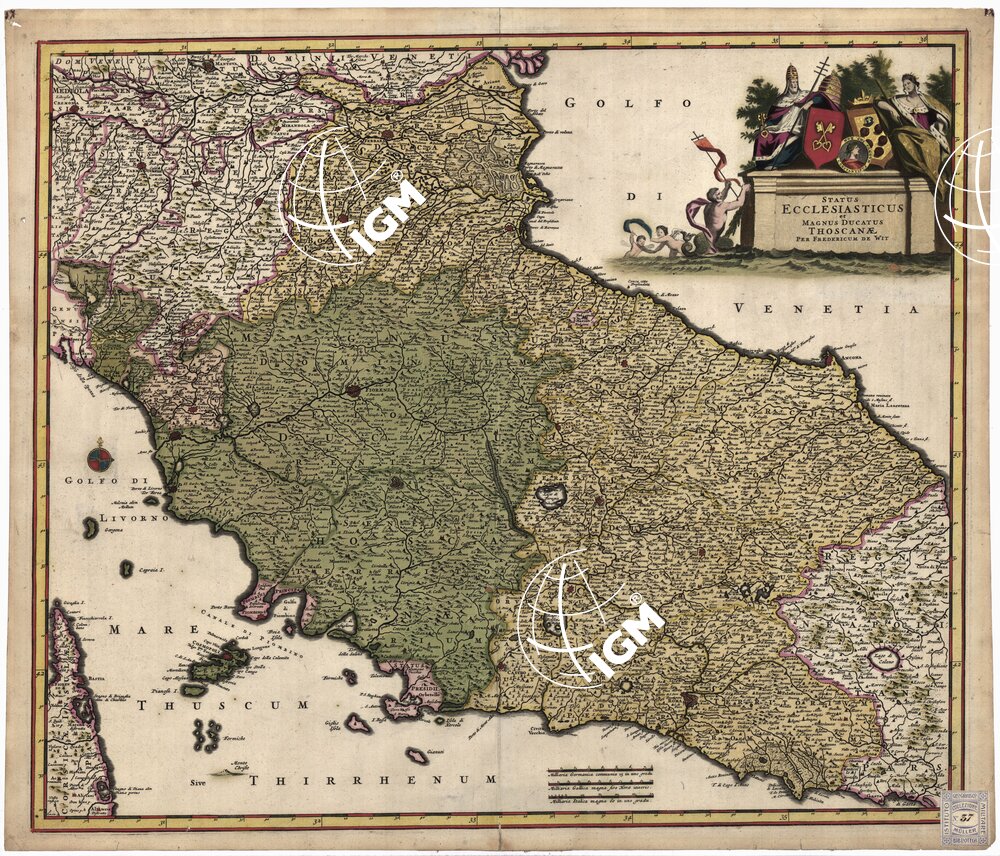 Foglio unico inciso su rame. Orientazione normale. Longitudini calcolate dalle isole del Capo Verde. Limiti: nord, Mantova; sud, Gaeta; ovest, Spezia; est, Civita di Pena. Orografia prospettica a monticelli. Abitati importanti rappresentati schematicamente in pianta e riempiti in rosso, gli altri con torri e case. Manca la rete stradale. Confini statali a colori nella copia n. 37 bis (B0008272).