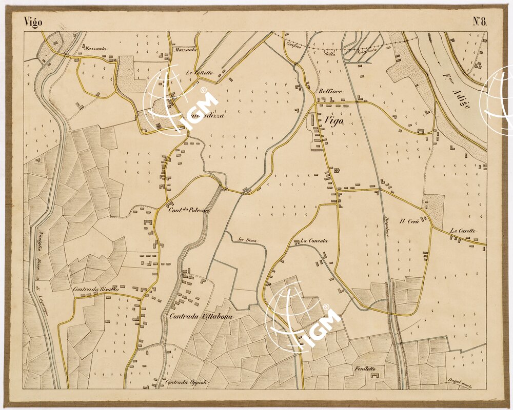 Carta in nove fogli montati su tela, stampati a colori. Distingue prati, vigneti, boschi, risaie, paludi, ghiaie, canali d’irrigazione, argini. Le strade sono distinte in postali (rosso), carreggiabili inghiaiate, non inghiaiate, mulattiere, sentieri (giallo). Sono indicate anche le ferrovie in progetto. Le acque sono colorate in azzurro. Il foglio n. 7 contiene l’elenco numerico degli edifici militari. Il foglio n. 9 contiene la legenda dei segni convenzionali e la scala grafica in metri.