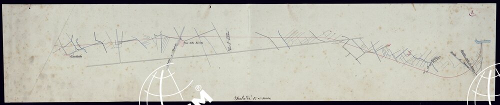 Il titolo non è presente sulla carta. Planimetrie di vari tronchi di ferrovia. Epoca 1851-1871. Disegni ad acquerello impiegati probabilmente per la carta generale segli Stati Sardi al 50.000.