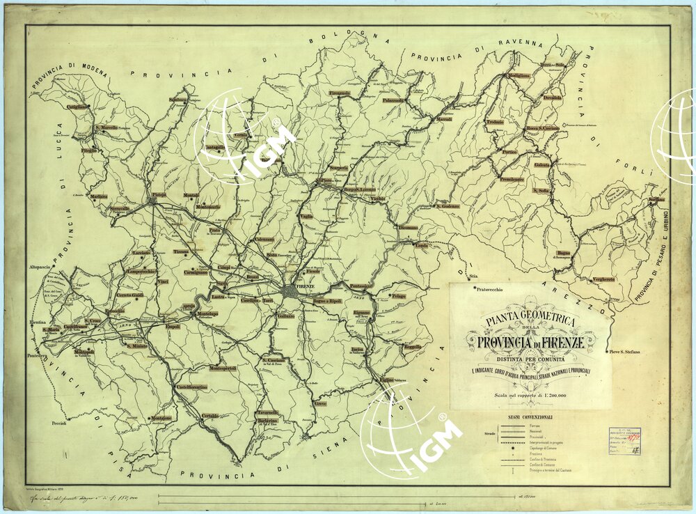 “e indicante corsi d’acqua principali, strade nazionali e provinciali”. Un foglio montato su tela. Disegno originale con la sola planimetria. Mostra la rete stradale (ferrovie, nazionali, provinciali, interprovinciali, in progetto) i capoluoghi di comuni e le frazioni, i confini di provincia e di comuni.