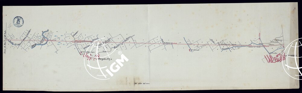 Planimetrie di vari tronchi di ferrovia. Epoca 1851-1871. Disegni ad acquerello impiegati probabilmente per la carta generale degli Stati Sardi al 50.000.