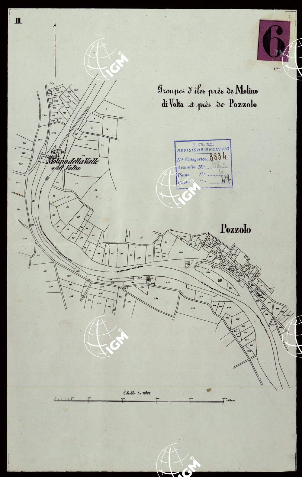 Disegno su tela lucida. Due copie a colori e una terza in nero in sei piccoli fogli. Un secondo lucido su tela, pure a colori, si riferisce al tratto del Mincio tra Rivalta e C. Pardinali (Mantova). E' alla stessa scala e misura cm. 62×63.