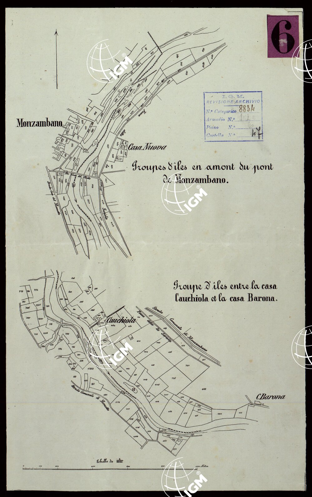 Disegno su tela lucida. Due copie a colori e una terza in nero in sei piccoli fogli. Un secondo lucido su tela, pure a colori, si riferisce al tratto del Mincio tra Rivalta e C. Pardinali (Mantova). E’ alla stessa scala e misura cm. 62×63.