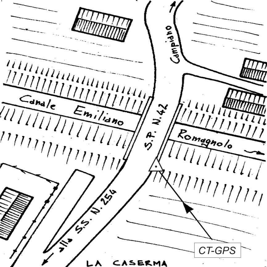 | Materializzazione | Centrino metallico infisso nella spalletta del ponte che attraversa il Canale Emiliano Romagnolo, lungo la S.P. 42, in località La Caserma. |