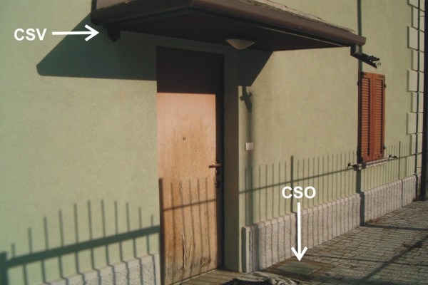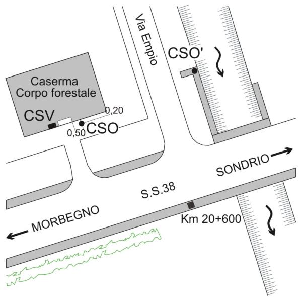 | Contrassegni | [{"simbolo_contrassegno":"P3","materializzazione":"(CSO) – Chiusino in ghisa rialzato con pozzetto in cemento e protetto da coperchio in vetro, posto alla base della facciata della caserma del Copo Forestale dello Stato, a destra della porta. Alto non pi\u00f9 misurabile."},{"simbolo_contrassegno":"V1","materializzazione":"(CSV) – Mensola infissa sulla facciata, in corrispondenza del CSO."},{"simbolo_contrassegno":"B4","materializzazione":"(CSO') – Centrino universale infisso sul muro di sponda del canale posto sul lato destro di Via Empio, subito dopo la caserma del Corpo Forestale dello Stato."}] |