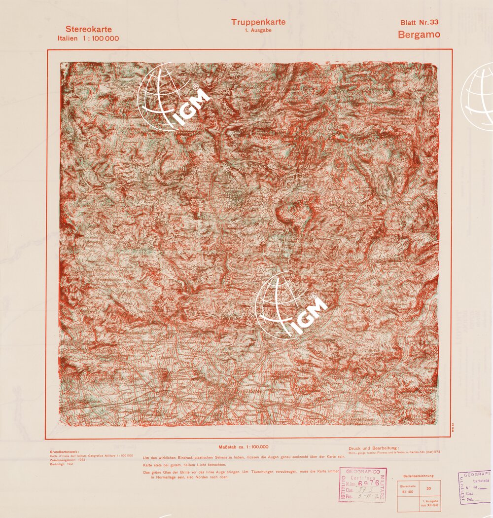 TRUPPENKARTE – STEREOKARTE – (CARTA STEREOSCOPICA PER USO MILITARE) – Foglio 33 – Bergamo