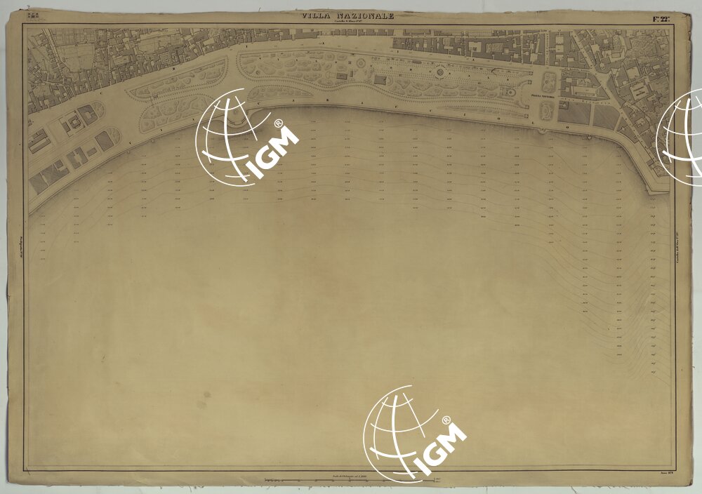 La carta si compone di 23 fogli incisi su rame stampati in nero. Essa fu costruita a cura del Municipio di Napoli sotto la direzione del Prof. di Geodesia C. Schiavoni, iniziata nel 1863 e ultimata verso il 1870. L’orografia è rappresentata col tratteggio e curve di livello tracciate all’equidistanza di m. 2. Gli scandagli sono calcolati in metri. Due copie una delle quali in fogli montati su tela e con curve batometriche (Docum. n. 15). Il titolo non è presente sulla carta.