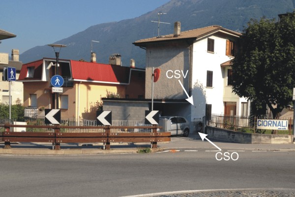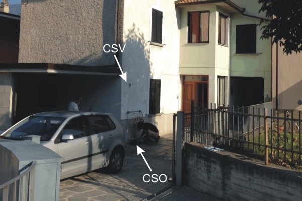 | Contrassegni | [{"simbolo_contrassegno":"P3","materializzazione":"(CSO) – Chiusino in ghisa, rialzato per nuova pavimentazione e protetto da coperchio in ghisa anonimo,posto alla base della facciata ed in prossimit\u00e0 dello spigolo di sinistra. Alto non pi\u00f9 misurabile."},{"simbolo_contrassegno":"V1","materializzazione":"(CSV) – Mensola infissa sul muro di facciata, sopra il CSO."}] |