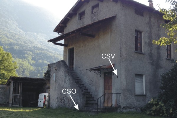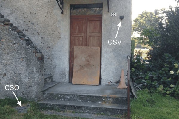 [{"simbolo_contrassegno":"P3","materializzazione":"(CSO) – Chiusino in ghisa posto alla base del muro di sostegno della scala di accesso al piano superiore ed in corrispondenza del terzo gradino."},{"simbolo_contrassegno":"V1","materializzazione":"(CSV) – Mensola infissa sul muro della casa dalla parte della scala presso lo spigolo destro."}]
