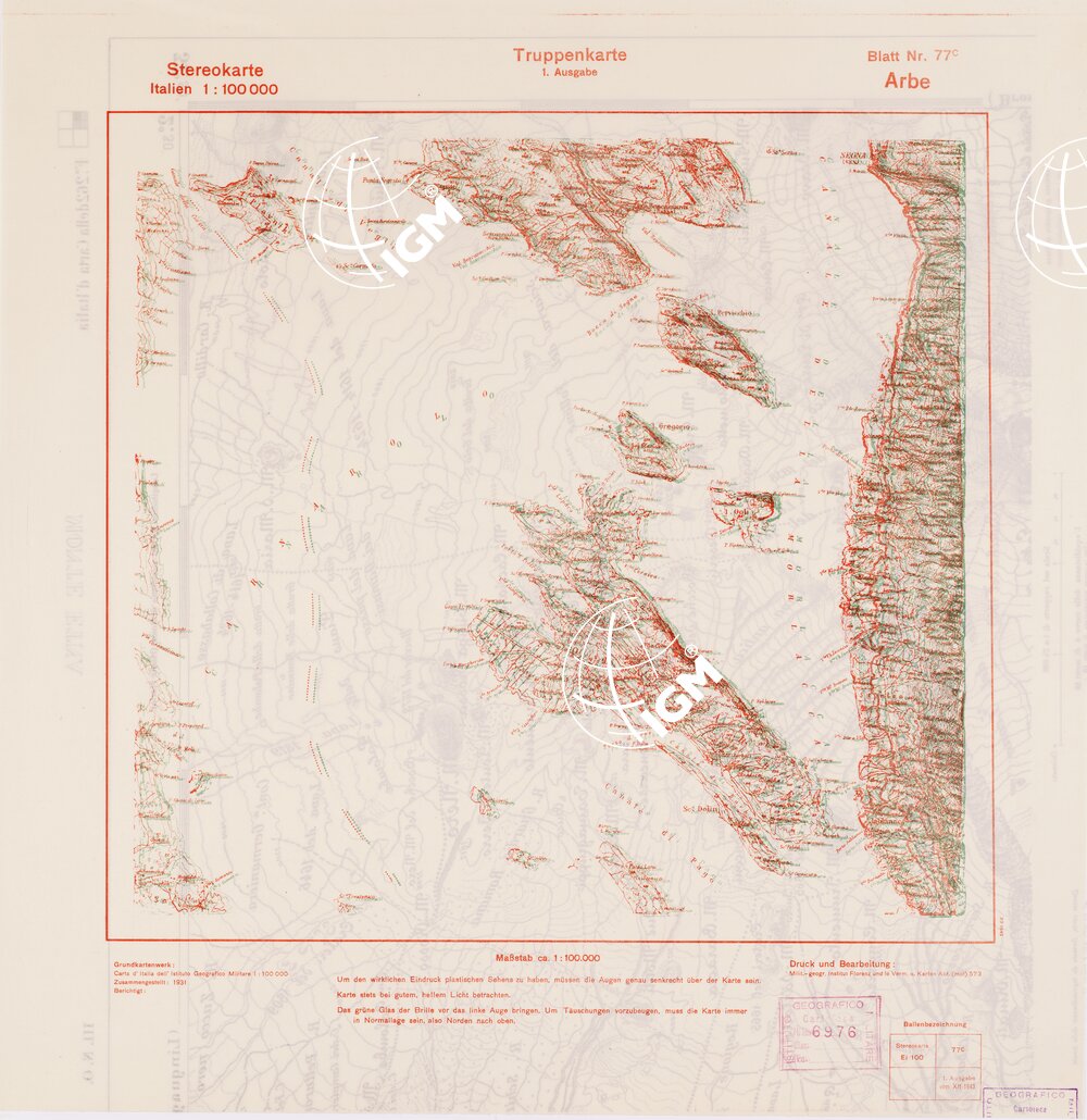 TRUPPENKARTE – STEREOKARTE – (CARTA STEREOSCOPICA PER USO MILITARE) – Foglio 77C – Arbe