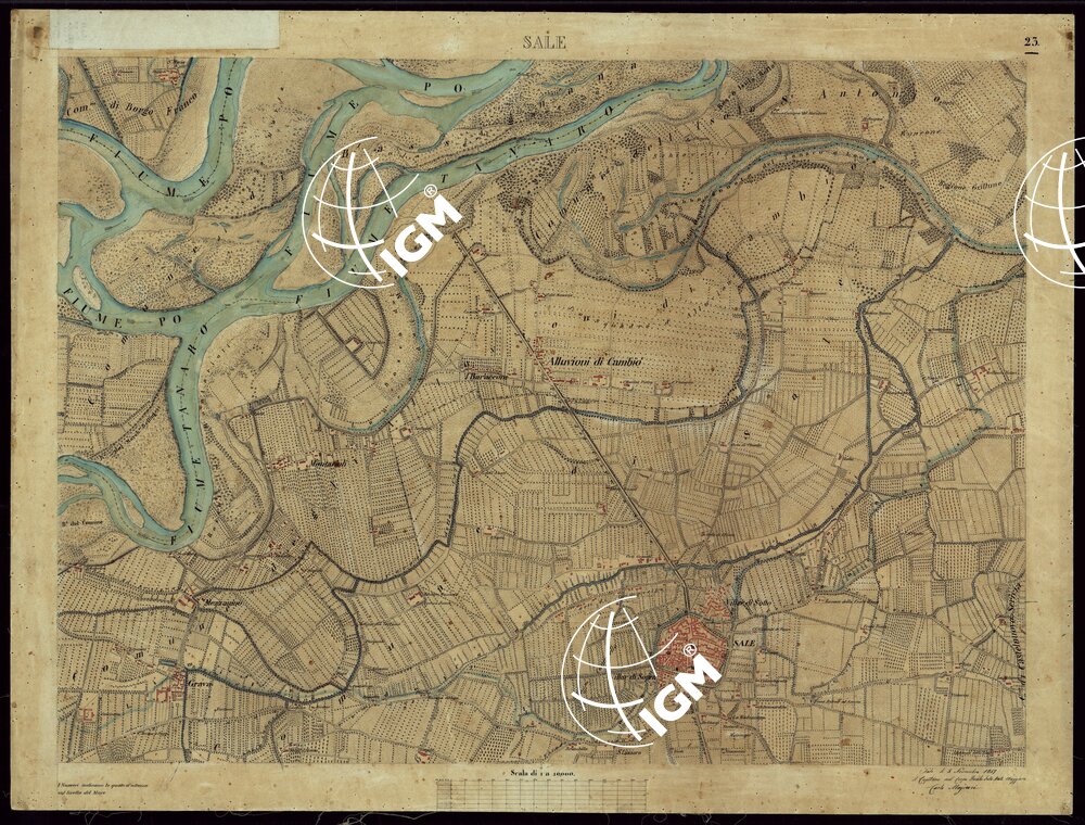 Gruppo di 55 tavolette rilevate da ufficiali dello Stato Maggiore. Quarantacinque di esse sono formate dalla riunione di rilievi parziali e ridisegnate in ufficio; undici sono rilievi originali di campagna. Alcune sono aggiornate al 1885 in base a nuove ricognizioni ed alle levate al 5.000. Ciascuna reca la firma degli operatori e dei revisori. Esse rappresentano l’orografia a curve di livello tracciate alla equidistanza di 5 m.; abitati in rosso, acque in azzurro, rimanente della planimetria e toponomastica in nero. Fogli montati su tela.