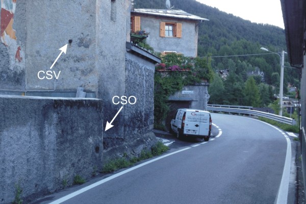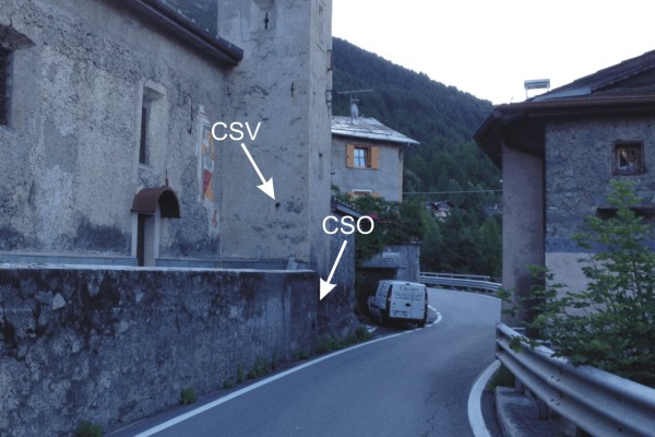 [{"simbolo_contrassegno":"B1","materializzazione":"(CSO) – Bullone infisso sul basamento del campanile, spigolo di sinistra, lato strada."},{"simbolo_contrassegno":"V1","materializzazione":"(CSV) – Mensola infissa sulla facciata del campanile, lato nord, spigolo di destra."}]