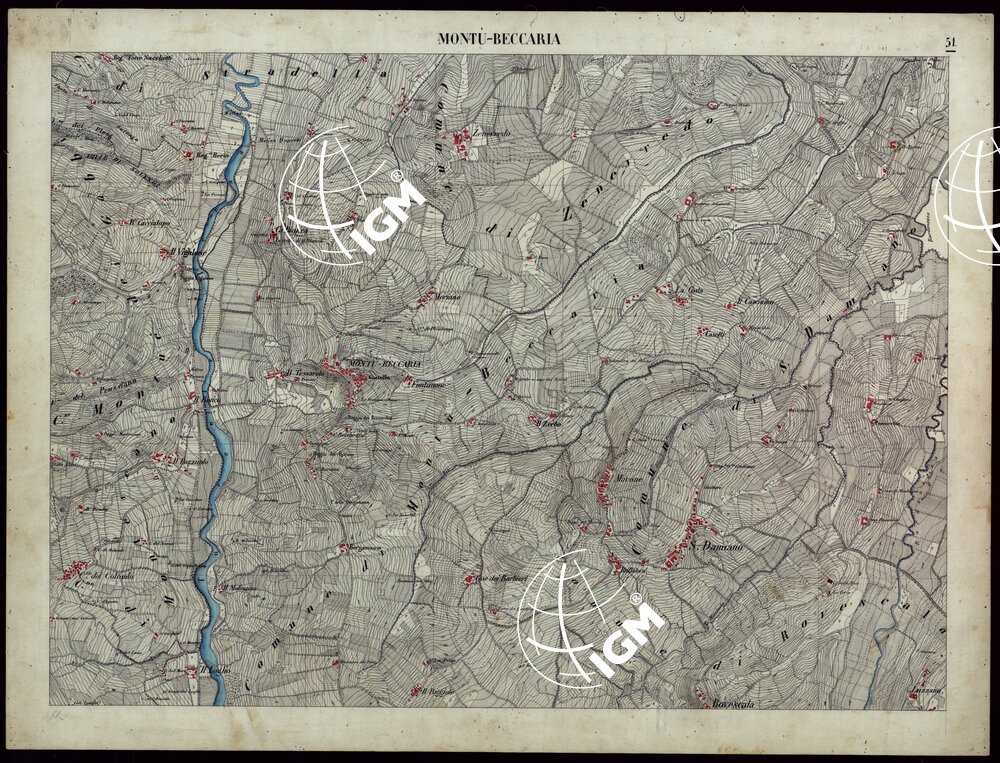 Gruppo di 55 tavolette rilevate da ufficiali dello Stato Maggiore. Quarantacinque di esse sono formate dalla riunione di rilievi parzaiali e ridisegnate in ufficio; undici sono rilievi originali di campagna. Alcune sono aggiornate al 1885 in base a nuove ricognizioni e alle lavate al 25.000. Ciascuna reca la firma degli operatori e dei revisori. Esse rappresentano l’orografia a curve di livello tracciate alla equidistanza di 5 m.; abitati in rosso, acque in azzurro, rimanente della planimetria e toponomastica in nero. Fogli montati su tela.