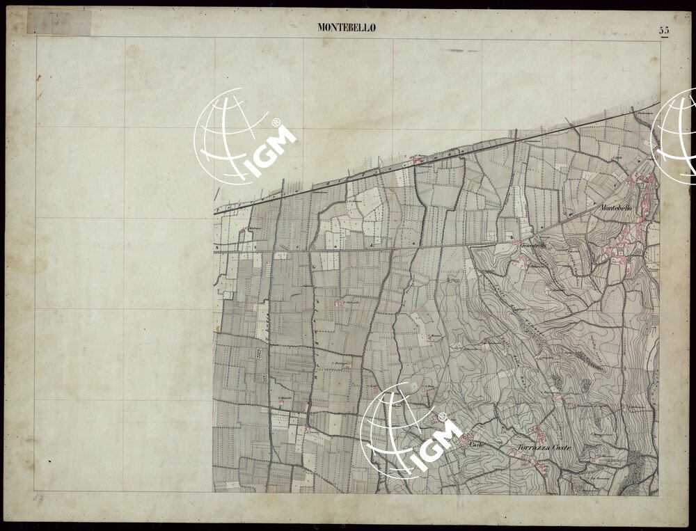 Gruppo di 55 tavolette rilevate da ufficiali dello Stato Maggiore. Quarantacinque di esse sono formate dalla riunione di rilievi parziali e ridisegnate in ufficio; undici sono rilievi originali di campagna. Alcune sono aggiornate al 1885 in base a nuove ricognizioni ed alle lavate al 25.000. Ciascuna reca la firma degli operatori e dei revisori. Esse rappresentano l’orografia a curve di livello tracciate alla equidistanza di 5 m.; abitati in rosso, acque in azzurro, rimanente della planimetria e toponomastica in nero. Fogli montati su tela.