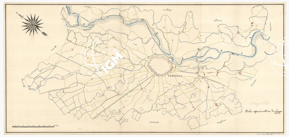 Il titolo non è presente sulla carta. Copia, più accuratamente disegnata, della carta al documento n. 29 – categorico n. 9232. Fuori margine l’indicazione: Giuseppe Degrandi Ing.re Topografo di S.M., il visto: Le Gen. M.s. Costa Beauregard.