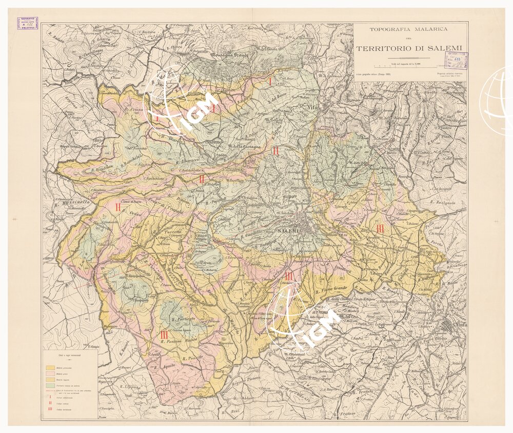 Un foglio che mostra a colori la distribuzione delle zone malariche in rapporto ai vari gradi di intensità della malaria.