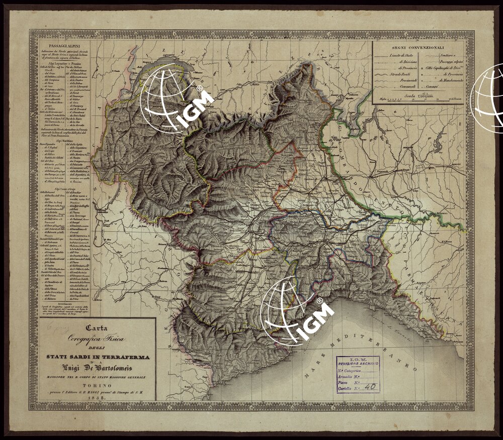 Incisione su rame in foglio unico. Orografia dimostata mediante il tatteggio a luce obliqua. Planimetria in nero. Abitati distinti in base alla loro importanza amministrativa. Strade classificate in reali, provinciali, comunali, sentieri e passaggi alpini. A sinistra elenco dei valichi alpini. Due esemplari, questa montata su tela con confini a colori e l’altra in bianco e nero.