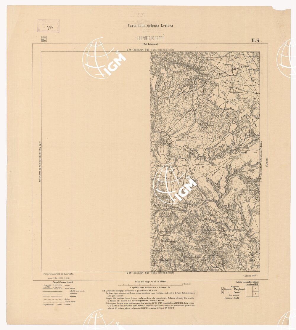 I.G.M. Riproduzione fotozincografica delle levate originali eseguite alla medesima scala tra gli anni 1885 e 1891. Questa carta comprende la parte centrale della Colonia tra Zula, Emberèmi, Giangheren e Himberti.