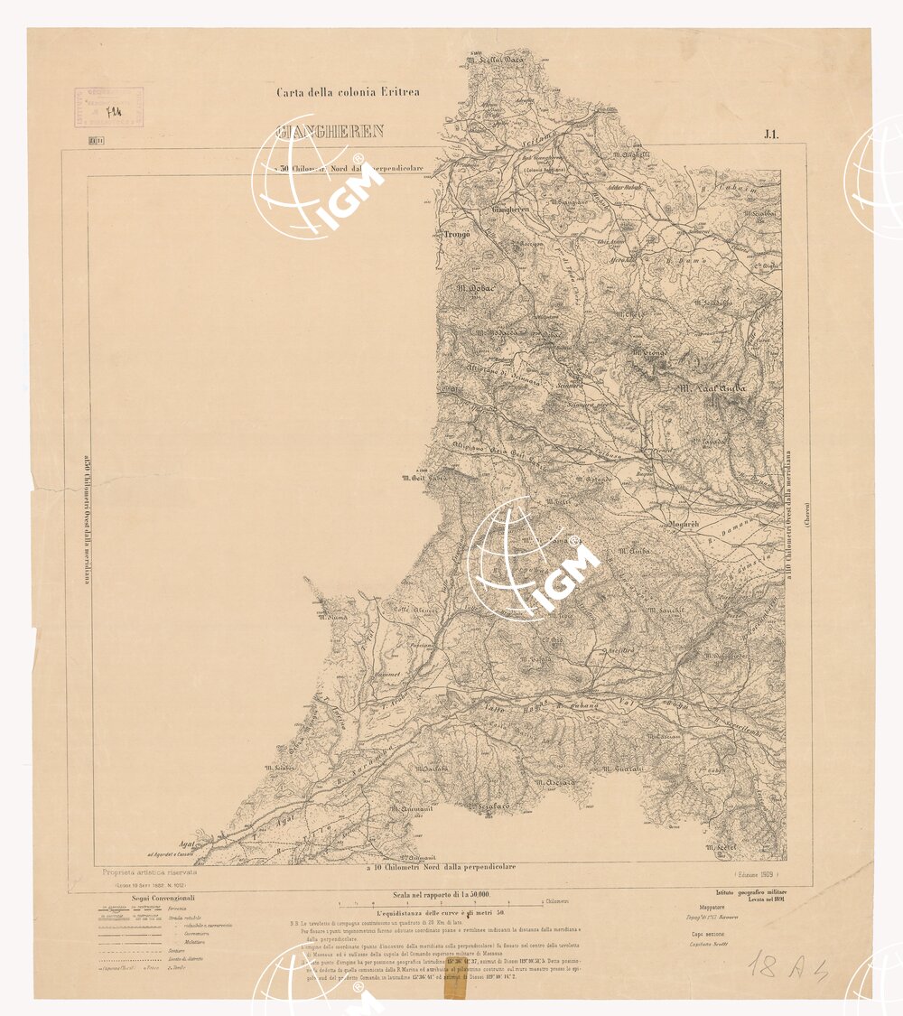 I.G.M. Riproduzione fotozincografica delle levate originali eseguite alla medesima scala tra gli anni 1885 e 1891. Questa carta comprende la parte centrale della Colonia tra Zula, Emberèmi, Giangheren e Himberti.