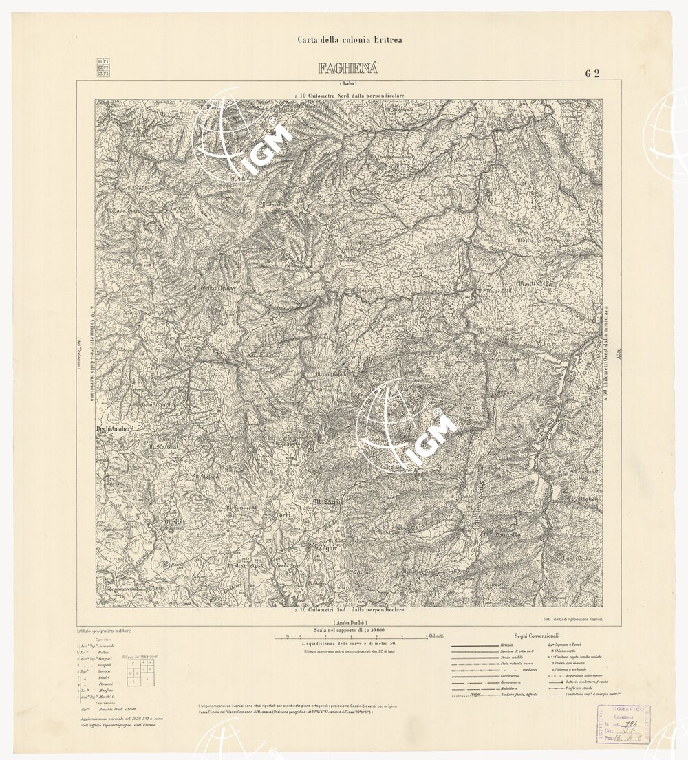 I.G.M. Riproduzione fotozincografica delle levate originali eseguite alla medesima scala tra gli anni 1885 e 1891. Questa carta comprende la parte centrale della Colonia tra Zula, Emberèmi, Giangheren e Himberti.