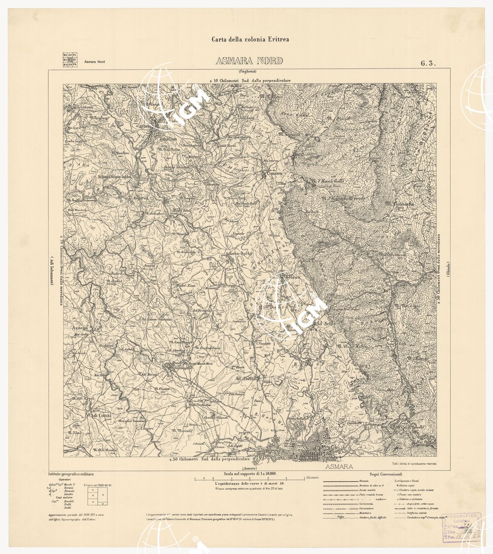 I.G.M. Riproduzione fotozincografica delle levate originali eseguite alla medesima scala tra gli anni 1885 e 1891. Questa carta comprende la parte centrale della Colonia tra Zula, Emberèmi, Giangheren e Himberti.