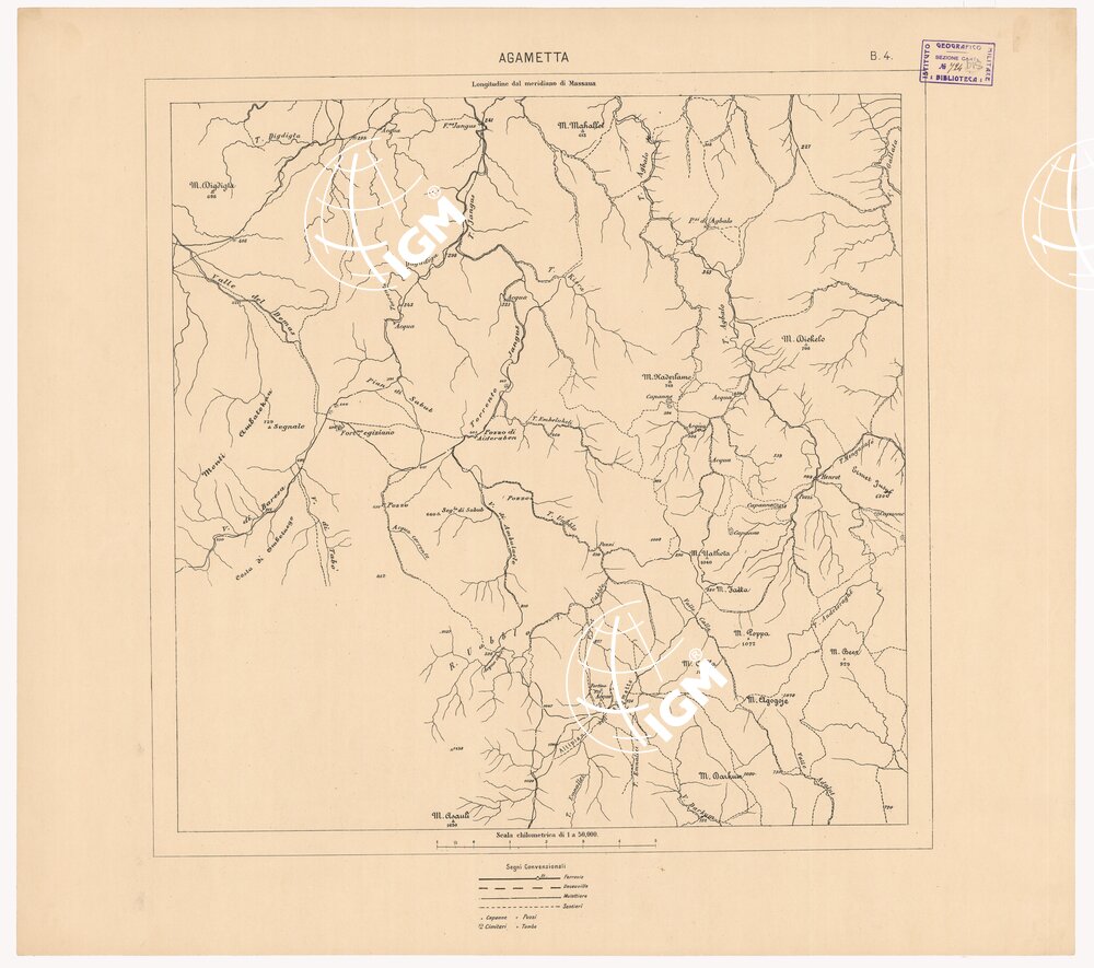 I.G.M. Riproduzione fotozincografica delle levate originali eseguite alla medesima scala tra gli anni 1885 e 1891. Questa carta comprende la parte centrale della Colonia tra Zula, Emberèmi, Giangheren e Himberti.