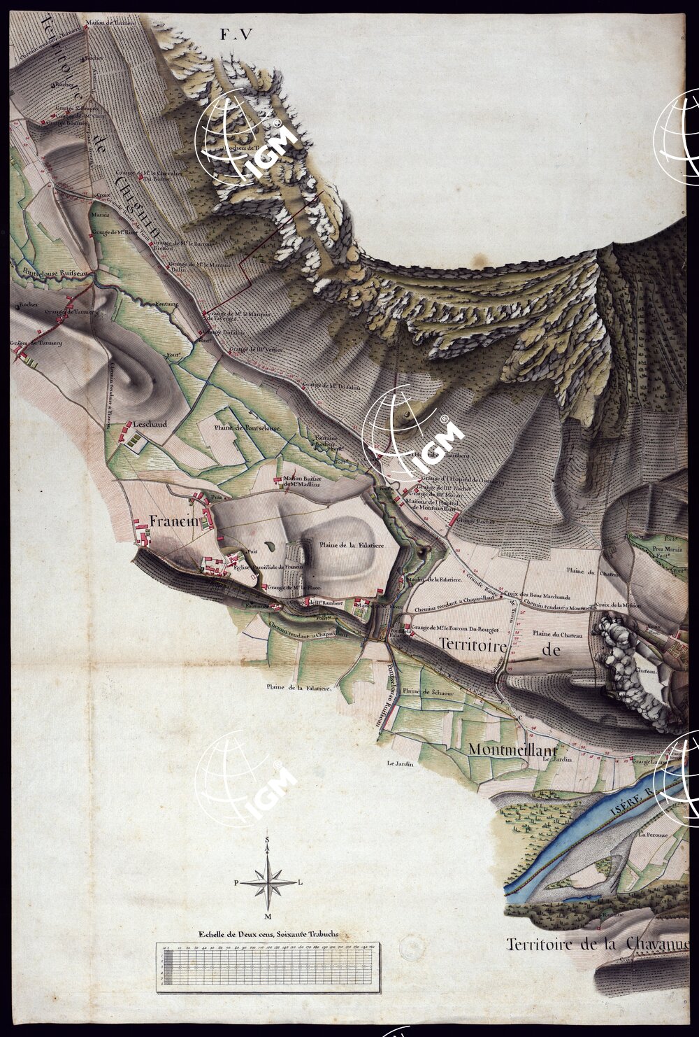 La Carta è in 23 fogli e un quadro d’unione alla scala di 1:56.700. Scala grafica di 200 trabucchi = m. 0,129. Rappresenta la grande strada che seguendo il corso dell’Arc, mette in comunicazione Chambery con S. Giovanni di Moriana, ed una striscia adiacente di territorio variabile da circa mezzo chilometro ad oltre 1 km. tanto da una parte quanto dall’altra. La carta è frutto di regolari operazioni metriche sul terreno, condotte certo con notevole abilità. Il disegno, acquerellato a più tinte, riproduce accuratamente i caseggiati nella loro pianta geometrica, la rete stradale, i corsi d’acqua, le coltivazioni, la natura e le forme del terreno. Una linea rossa delimita i confini delle parrocchie. Dei piccoli numeri in rosso ai due lati della strada si riferiscono probabilmente agli appezzamenti catastali. In complesso è un pregevole lavoro e un prezioso documento sia per la topografia della Savoia sia per l’evoluzione storica della topografia.
