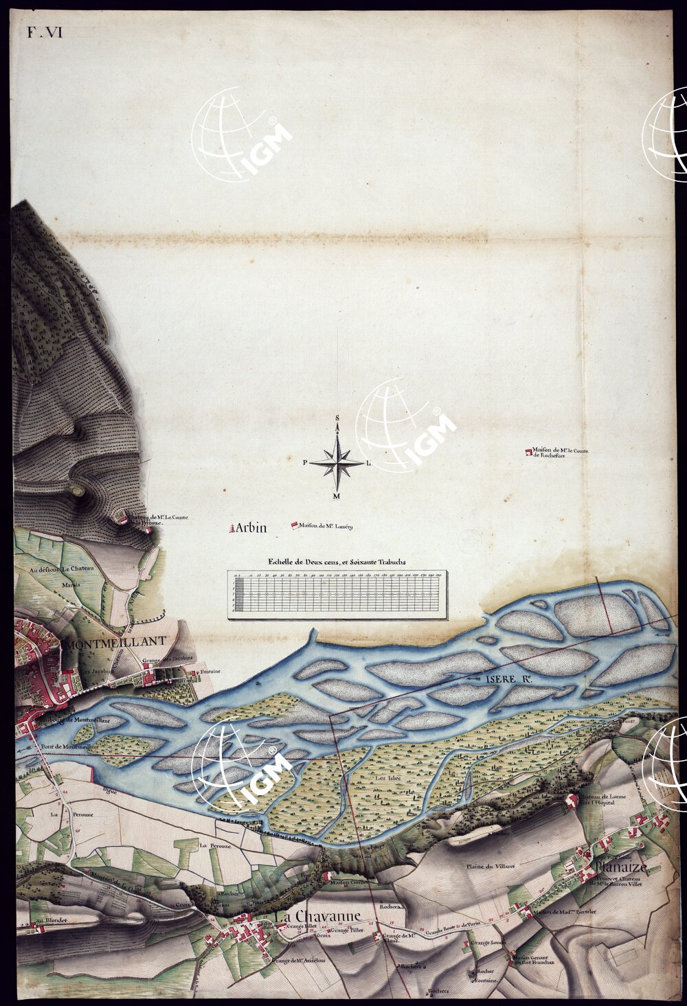 La Carta è in 23 fogli e un quadro d’unione alla scala di 1:56.700. Scala grafica di 200 trabucchi = m. 0,129. Rappresenta la grande strada che seguendo il corso dell’Arc, mette in comunicazione Chambery con S. Giovanni di Moriana, ed una striscia adiacente di territorio variabile da circa mezzo chilometro ad oltre 1 km. tanto da una parte quanto dall’altra. La carta è frutto di regolari operazioni metriche sul terreno, condotte certo con notevole abilità. Il disegno, acquerellato a più tinte, riproduce accuratamente i caseggiati nella loro pianta geometrica, la rete stradale, i corsi d’acqua, le coltivazioni, la natura e le forme del terreno. Una linea rossa delimita i confini delle parrocchie. Dei piccoli numeri in rosso ai due lati della strada si riferiscono probabilmente agli appezzamenti catastali. In complesso è un pregevole lavoro e un prezioso documento sia per la topografia della Savoia sia per l’evoluzione storica della topografia.