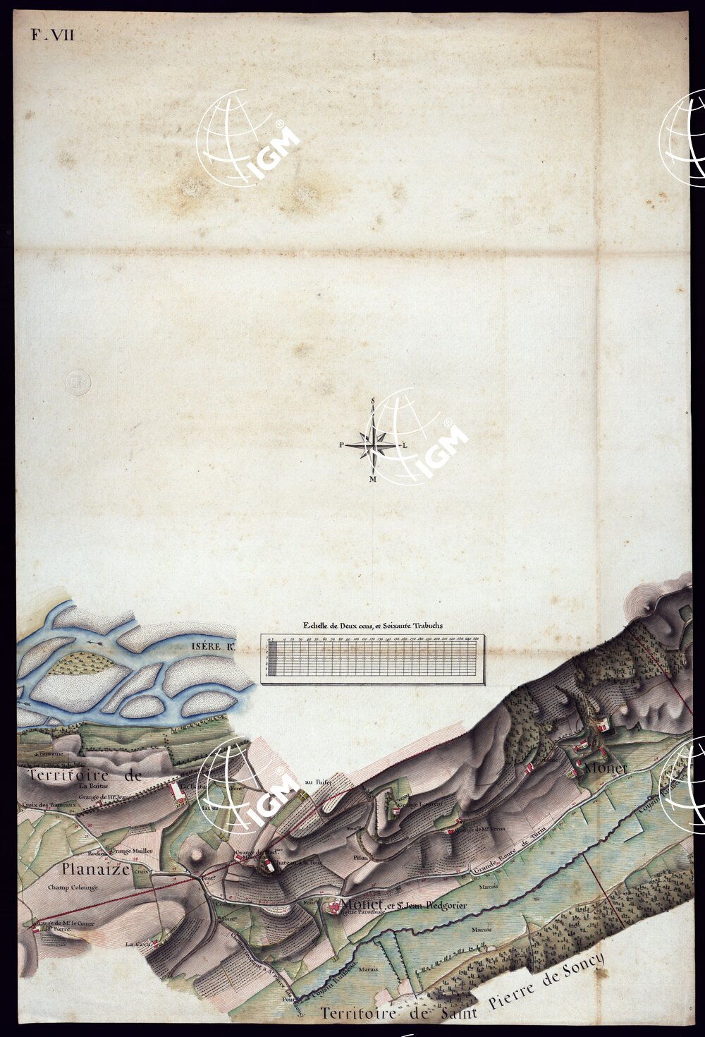 La Carta è in 23 fogli e un quadro d’unione alla scala di 1:56.700. Scala grafica di 200 trabucchi = m. 0,129. Rappresenta la grande strada che seguendo il corso dell’Arc, mette in comunicazione Chambery con S. Giovanni di Moriana, ed una striscia adiacente di territorio variabile da circa mezzo chilometro ad oltre 1 km. tanto da una parte quanto dall’altra. La carta è frutto di regolari operazioni metriche sul terreno, condotte certo con notevole abilità. Il disegno, acquerellato a più tinte, riproduce accuratamente i caseggiati nella loro pianta geometrica, la rete stradale, i corsi d’acqua, le coltivazioni, la natura e le forme del terreno. Una linea rossa delimita i confini delle parrocchie. Dei piccoli numeri in rosso ai due lati della strada si riferiscono probabilmente agli appezzamenti catastali. In complesso è un pregevole lavoro e un prezioso documento sia per la topografia della Savoia sia per l’evoluzione storica della topografia.