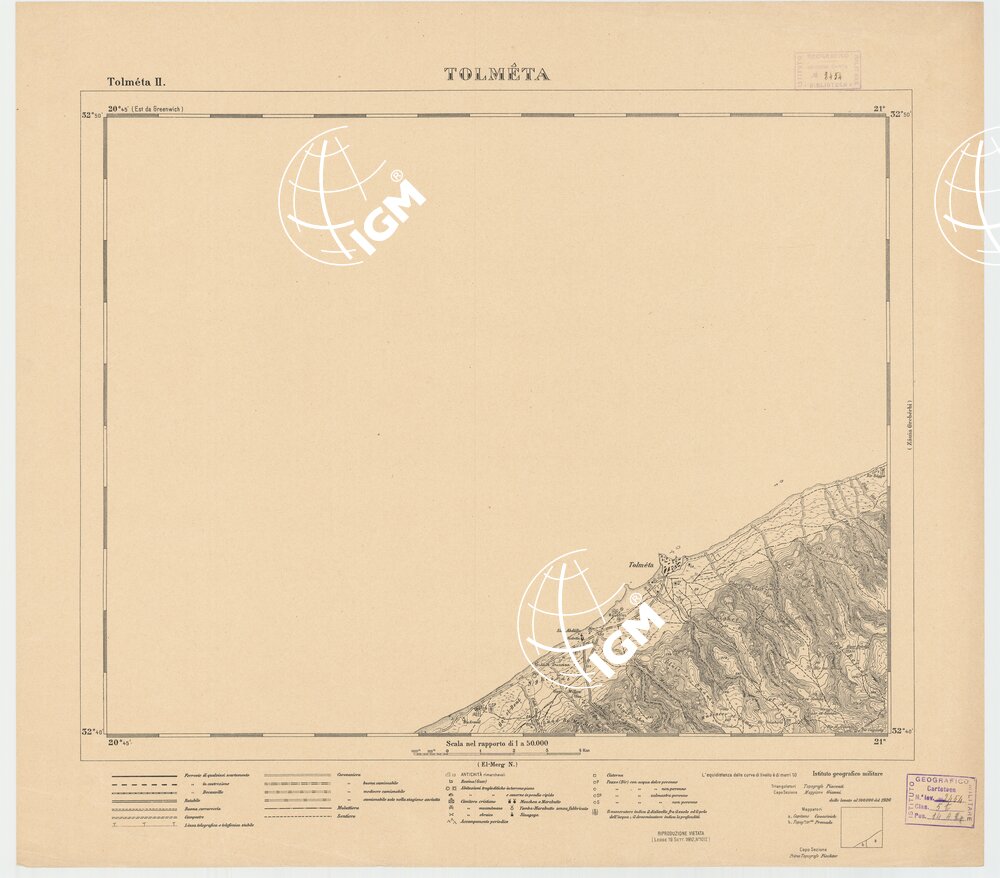 appoggiarono i nuovi lavori di rilievo. Le levate eseguite direttamente alla scala di 1:100.000 con procedimento grafico a mezzo della tavoletta pretoriana, adottando il sistema di proiezione naturale (come per le levate topografiche del Regno) in fogli di 30′ di longitudine per 20′ di latitudine, furono eseguite tenendo conto delle esigenze per un ingrandimento e un ridisegno al 50.000. La campagna topografica 1919-20 fruttava il rilievo di 6.000 kmq e nel 1921 vennero pubblicate 20 tavolette al 50.000 a cui si aggiunsero in seguito i tre quadranti (1923-24) del foglio di Bengasi. La zona rappresentata risulta quindi compresa tra Bengasi e Sidi Aon sulla costa e dal mare verso terra per una profondità di 40 km. La carta fu stampata in nero con l’adozione di speciali segni convenzionali rispondenti alle particolari condizioni della regione tenendo conto speciale della viabilità e della rete idrografica. Le forme del terreno sono rappresentate con curve di livello tracciate all’equidistanza di 10 metri. Questa carta dà una rappresentazione della Cirenaica ottima e porta un prezioso contributo alla morfologia della regione. Della carta furono pubblicate tre edizioni speciali a mostrare rispettivamente: 1) boschi e culture, 2) pozzi e cisterne, 3) i terreni (v. N° 17 d’ordine, N. 2685 d’ inv.). La buona riduzione delle levate al 50.000 permise anche un ingrandimento al 25.000 in 60 fogli pure in nero (ved. N° 18 d’ordine, N. 4165 d’ inventario).