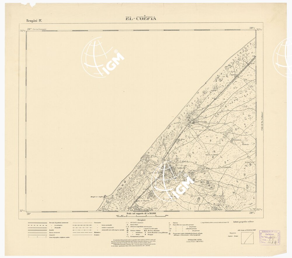 appoggiarono i nuovi lavori di rilievo. Le levate eseguite direttamente alla scala di 1:100.000 con procedimento grafico a mezzo della tavoletta pretoriana, adottando il sistema di proiezione naturale (come per le levate topografiche del Regno) in fogli di 30' di longitudine per 20' di latitudine, furono eseguite tenendo conto delle esigenze per un ingrandimento e un ridisegno al 50.000. La campagna topografica 1919-20 fruttava il rilievo di 6.000 kmq e nel 1921 vennero pubblicate 20 tavolette al 50.000 a cui si aggiunsero in seguito i tre quadranti (1923-24) del foglio di Bengasi. La zona rappresentata risulta quindi compresa tra Bengasi e Sidi Aon sulla costa e dal mare verso terra per una profondità di 40 km. La carta fu stampata in nero con l'adozione di speciali segni convenzionali rispondenti alle particolari condizioni della regione tenendo conto speciale della viabilità e della rete idrografica. Le forme del terreno sono rappresentate con curve di livello tracciate all'equidistanza di 10 metri. Questa carta dà una rappresentazione della Cirenaica ottima e porta un prezioso contributo alla morfologia della regione. Della carta furono pubblicate tre edizioni speciali a mostrare rispettivamente: 1) boschi e culture, 2) pozzi e cisterne, 3) i terreni (v. N° 17 d'ordine, N. 2685 d' inv.). La buona riduzione delle levate al 50.000 permise anche un ingrandimento al 25.000 in 60 fogli pure in nero (ved. N° 18 d'ordine, N. 4165 d' inventario).