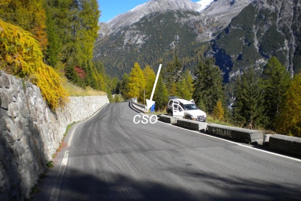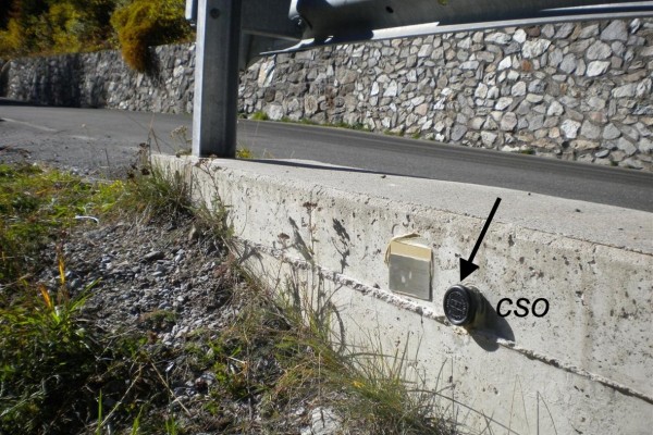 [{"simbolo_contrassegno":"B1","materializzazione":"(CSO) – Bullone infisso all'esterno del muro di sostegno in cemento armato, a valle della strada."}]