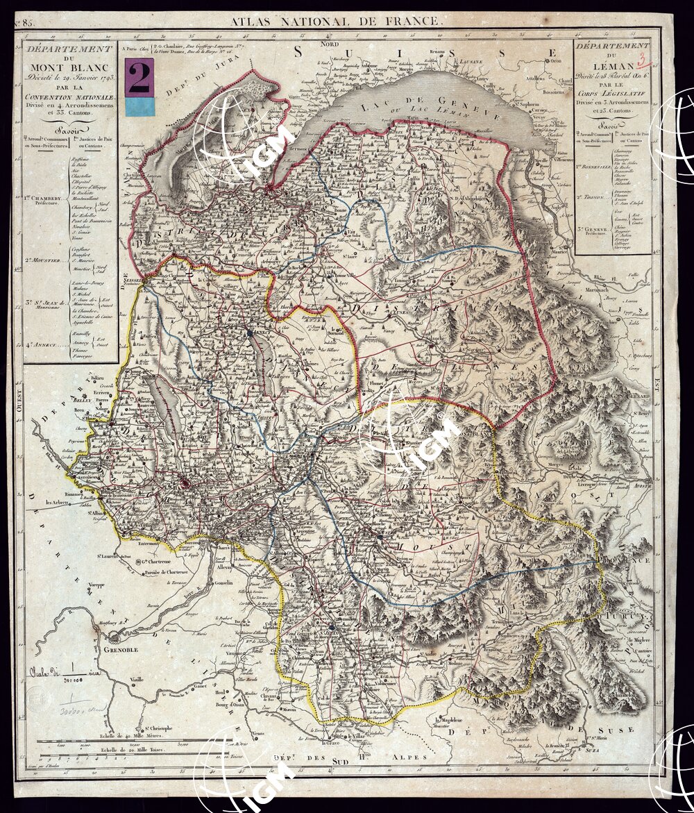 Incisione su rame in foglio unico. Orientazione normale. Orografia prospettica sussidiata talvolta con tratteggio. Abitati principali rappresentati in pianta: gli altri con torri e case o con circolini. E’ tracciata la rete stradale. Confini a colori. Toponomastica in francese. Incisore d’Houdan. In biblioteca c’è un ulteriore esemplare (Coll. Bianconi N° 47rosso) montato su tela a stacchi.