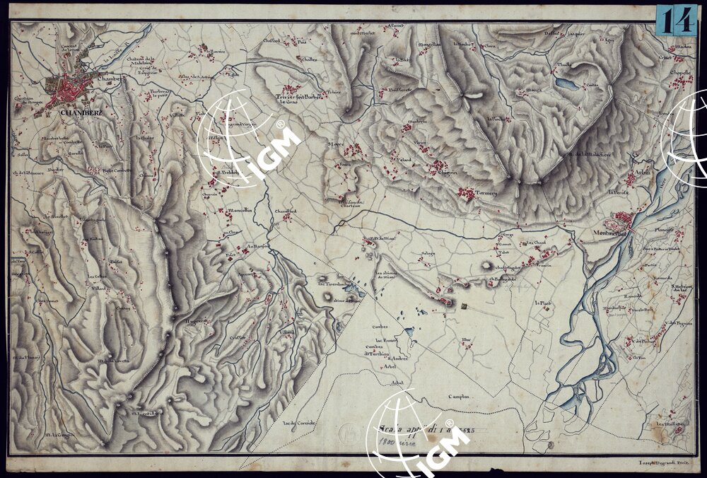 PLAN TOPOGRAPHIQUE DE LA PLAINE ET DES COLLINES EXISTANTES ENTRE CHAMBERY ET MONTMEILANT. CARTA TOPOGRAFICA DEL TERRITORIO COMPRESO TRA CHAMBERY E MONTMEILANT.