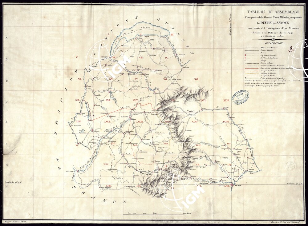 Il quadro d’unione reca in numeri romani la numerazione delle singole carte; ma la relativa carta non esiste presso l’Istituto Geografico Militare. Il territorio comprende il Ducato di Savoia più la parte del Piemonte compresa fra le due Dora e il Po. E’ stato eseguito dal Sig. Burzio Architetto e diretto dal Capitano Salasco.