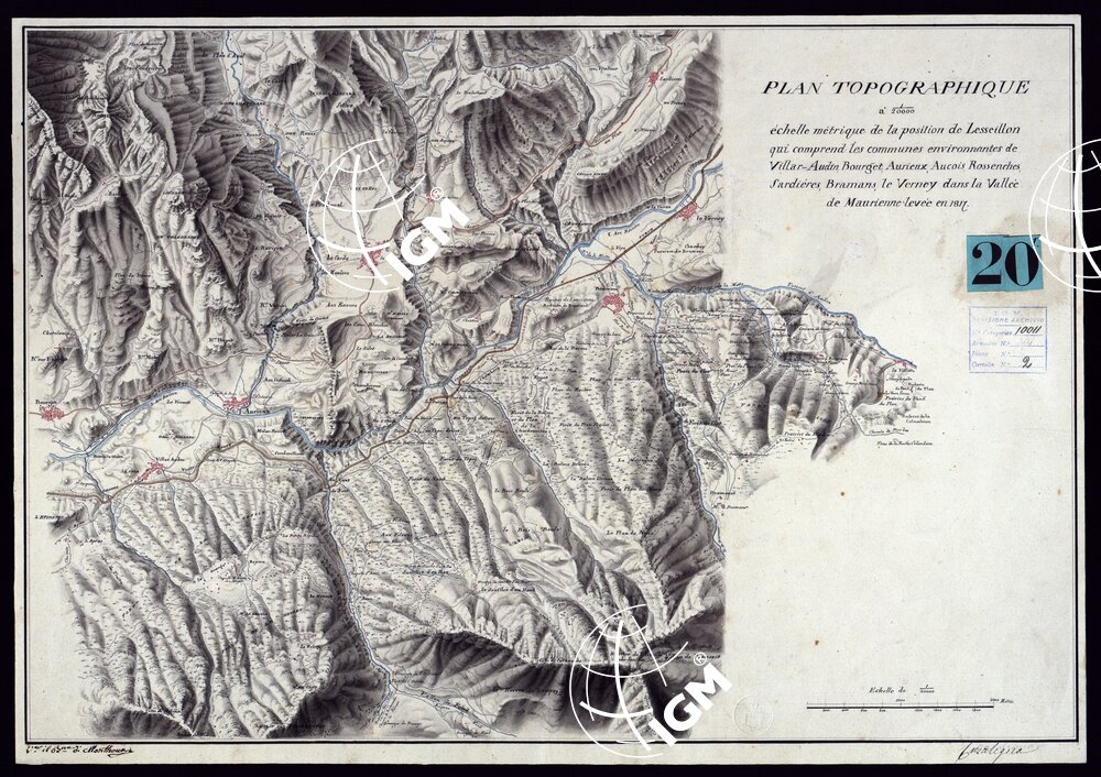 PLAN TOPOGRAPHIQUE A 1:20000 ECHELLE METRIQUE DE LA POSITION DE LESSEILON, QUI COMPREND LES COMUNES ENVIRONNANTES DE VILLAR AUDIN, BOURGET, AURIEUX, AUCOIS, ROSSENCHES, SARDIERES, BRAMANS, LE VERNEY DANS LA VALLE DE MAURIENNE LEVEE EN 1817 – FOGLIO 1.