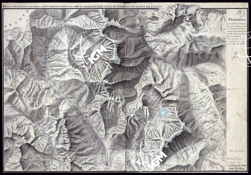Un foglio nitidamente disegnato a penna ed acquerellato rappresentante la zona montana dell’alta valle della Dora e dell’Arc tra Susa, Modane, Bardonneche, Fenestrelles e Bessans. Indicate con segni convenzionali speciali le grandi vie, le strade carrozzabili, le mulattiere e i sentieri e i posti da occuparsi militarmente. Senza data, ma può ritenersi del periodo 1817-18.