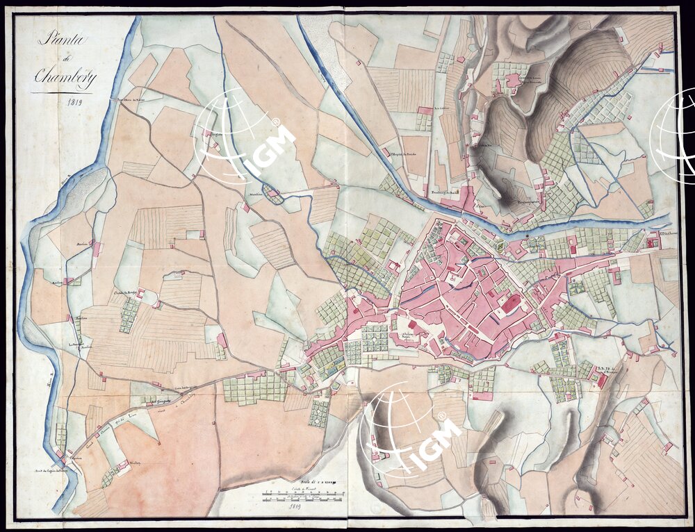 Un foglio disegnato a penna ed acquerellato a più tinte. Comprende la pianta della città, acquerellata in rosso e piccola parte del territorio adiacente sino al Torrente Hiere. Non porta indicazione di autore nè data, ma dalle notizie di archivio è ritenuta posteriore al 1818.