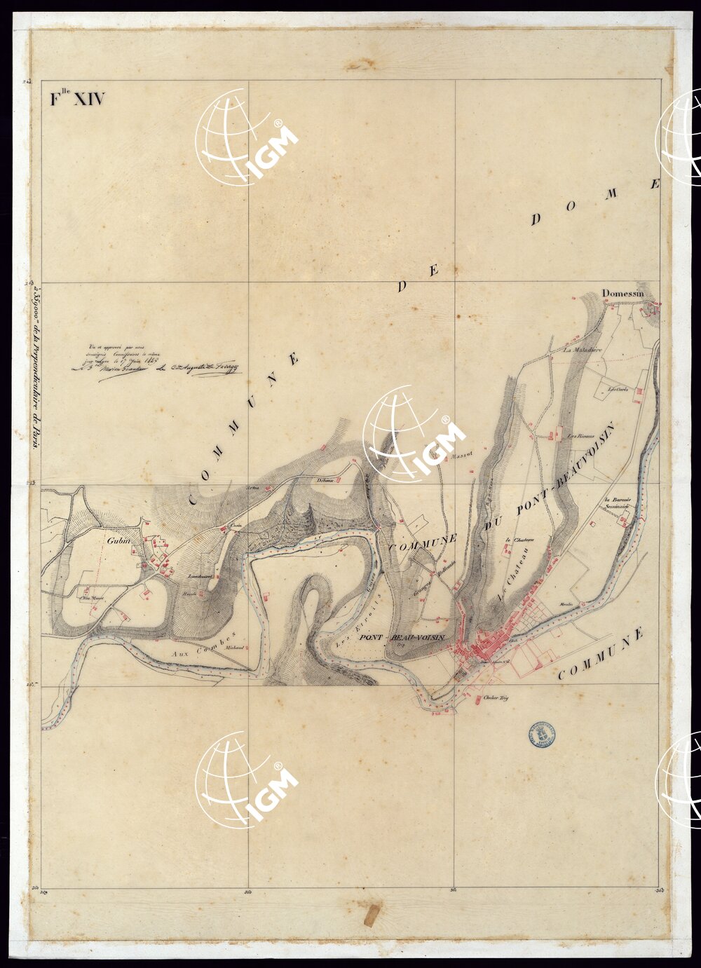 Disegno a penna su carta lucida, probabilmente copia di un disegno originale. La carta si compone di 21 fogli (dei quali i primi 4 in due parti) ed un quadro d’unione per cui complessivamente consta di 26 grandi fogli non totalmente riempiti. E’ riprodotto il corso del Rodano da un punto a circa 2 km. a monte di Anglefort sino alla confluenza del Guiers ed il corso di quest’ultimo sino al Pont Saint Martin poco a monte di Les Echelles. Il disegno è in azzurro per le acque, in rosso per i fabbricati, le dighe, il confine e le misure di riferimento; in nero per la rete stradale, il tratteggio orografico e le scritture. Il Quadro d’Unione alla scala di 1:100.000 porta in calce un elenco di 42 posizioni determinate per le loro coordinate rettangolari riferite alla meridiana ed alla perpendicolare di Parigi in base alle quali è tracciato il reticolato cassiniano della Carta. Documento interessante per la topografia storica dei fiumi rappresentati.